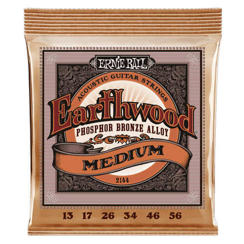 Earthwood Medium Phosphor Bronze Acoustic Guitar Strings. Made from 92% copper, 7.7% tin, 0.3% phosphorus wire wrapped around tin plated hex shaped steel core wire. These guitar strings have a light orange, gold color and provide a mellow, ringing sound, with excellent clarity. Gauges .013, .017, .026, .034, .046, .056.