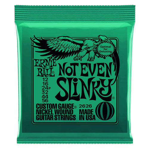 Optimal For Detuning. Ernie Ball Not Even Slinky Electric Strings are perfect for those who like to detune their instrument to lower tuning combinations. Metal fans worldwide have gravitated towards the Not Even Slinky set to give their guitar the optimal gauge combination for Drop D amp Drop C tuning. These strings are precision manufactured to the highest standards and most exacting specifications to ensure consistency, optimum performance, and long life. Not Even Slinky wound strings are made from nickel plated steel wire wrapped around a hex shaped steel core wire. The plain strings are made of specially tempered tin plated high carbon steel producing a well balanced tone for your guitar. Gauges .012 .016 .024p .032 .044 .056.