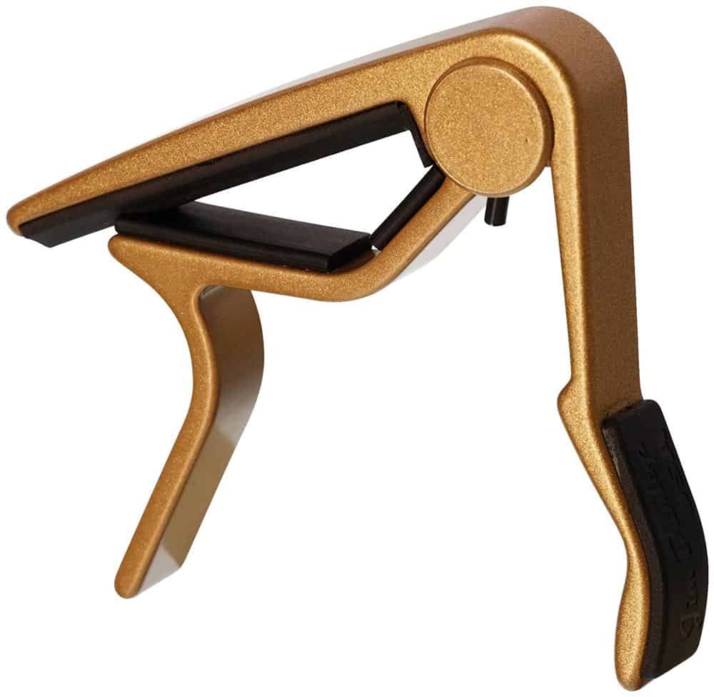 Acoustic trigger capo. Flat, gold. Ergonomic shape and padded handle make fret positioning easy. The strong spring action clamps it firmly in place. Available in five finishes. Made in the USA. For 6 and 12 string guitars.