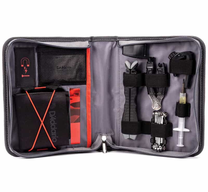 Bass guitar maintenance kit. Includes: high quality travel case, non-slip protective body mat, string height gauge, pro-winder, headstand, multi-tool, lubrikit, fret polishing system, and NS capo lite.