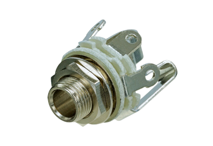 3 pole open 1/4” jack, 3 contacts, with washer and nut, panel thickness 3.5 mm, with 0.205″ faston tabs