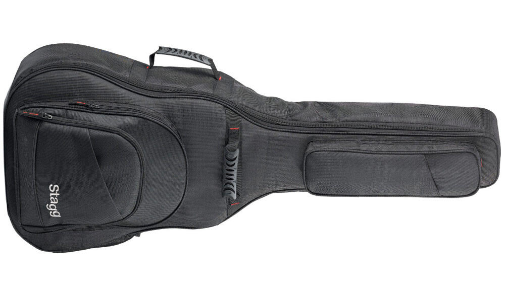Ndura series padded ballistic nylon bag for western guitar. Padding: 10 mm high-density foam and 2.5 mm elastic rubber impact sheet. Material: 1680 D ballistic nylon. Lining: Nylon. 2 adjustable padded shoulder straps and 2 reinforced handles, 1 zipper. 1 pouch for effects pedals, 1 pouch for scores and small accessories, 1 pouch for personal equipment and 1 mesh side-pocket. Thickness: 15 mm. Colour: Black.