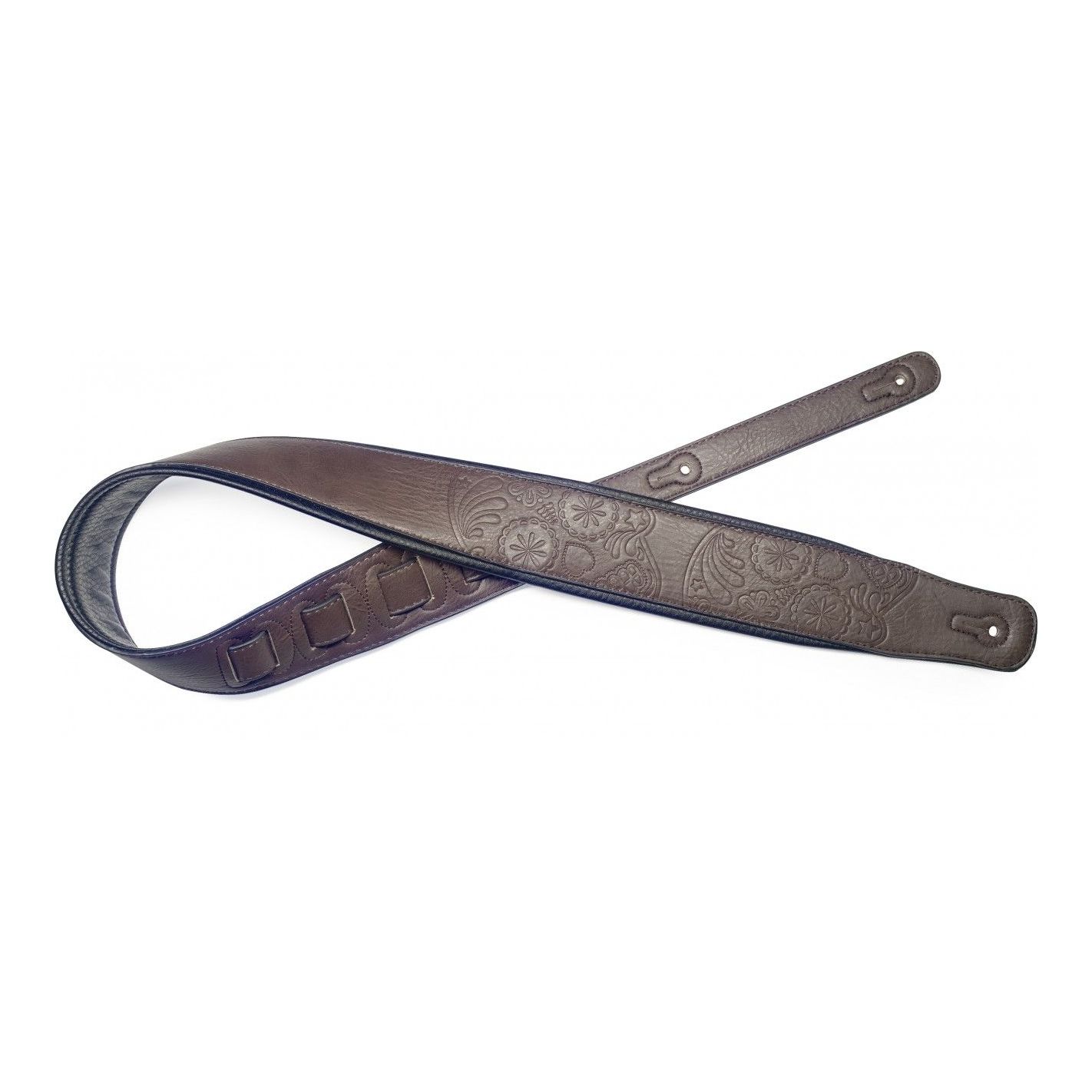 STAGG DARK BROWN PADDED LEATHERETTE GUITAR STRAP WITH MEXICAN SKULL PATTERN