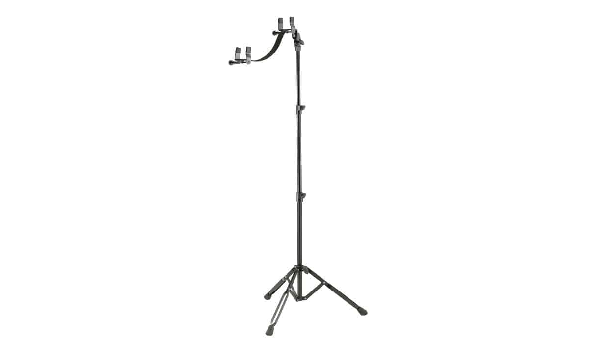 For acoustic guitars, for convenient playing. 2-way height adjustment. Felt-lined instrument support arm. Angle and length adjust to your needs.