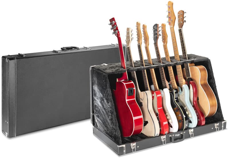 Universal guitar stand case for 8 electric or 4 acoustic guitars. Materials: Wood (case), black vinyl (finish) and plush (interior). Use: Stage or studio. Size (when closed): 108 x 53 x 13 cm (42.6 x 20.8 x 5.1").