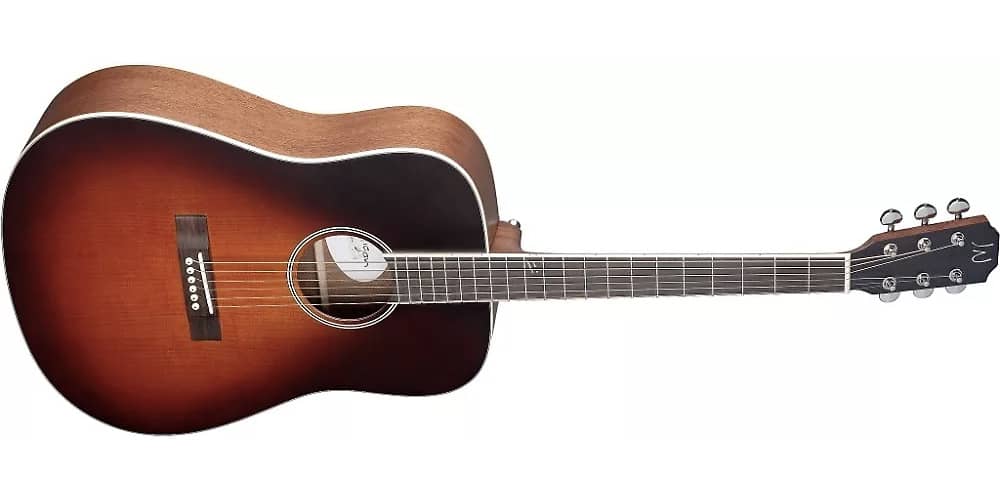 Steel string acoustic dreadnought guitar, Ezra series, solid cedar top, sapelli back and sides, mahogany neck, neck profile: oval “C” shape, rosewood fingerboard with side dots and one abalone inlay at the 12th fret, rosewood bridge, bone nut and saddle, machine heads: diecast nickel. Strings: D’Addario EXP. Satin Sunburst finish.