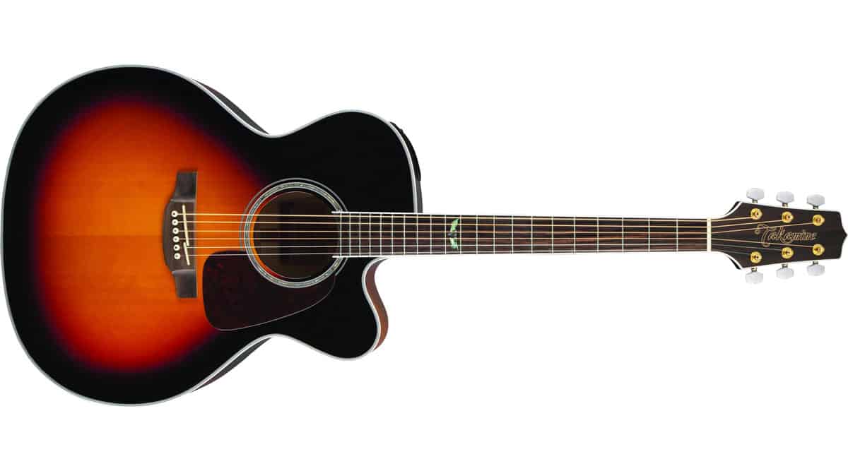 Steel string guitar with Jumbo with cutaway body shape. Solid spruce top, Flamed Maple bottom and sides, maple neck, rosewood fretboard, 20 frets, 644 mm scale, 43 mm nut, Takamine TP-40D preamp with built-in tuner, Mother-of-pearl rosette, gold hardware. Finish: Brown Sunburst Gloss.