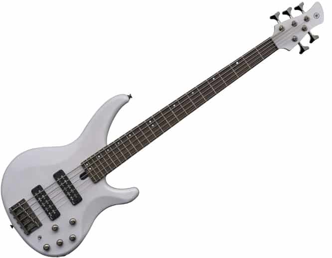 5 string Bass Guitar, mahogany body, 5 stripe maple/mahogany bolt-on neck, rosewood fretboard, 864mm scale length (long scale), 24 frets, 43mm nut width, 2 Alnico humbucker pickups, active/passive switch, translucent white finish
