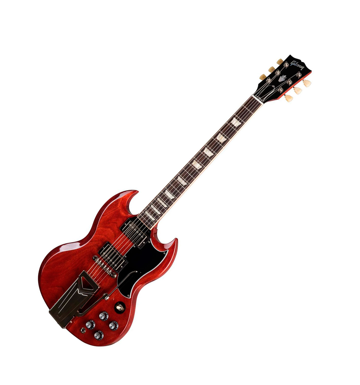 The SG Standard ‘61 Sideways Vibrola returns to the classic design that made it relevant, played and loved — shaping sound across generations and genres of music. As the name implies, the Gibson SG Standard ’61 Sideways Vibrola is equipped with the unique Sideways side-pull action vibrato similar to those found on the early 60’s models. Standard features include a slim taper mahogany neck and a bound rosewood fingerboard. The mahogany body features a deeply sculpted body scarfing, a 5-ply teardrop pickguard and a 22nd-fret neck joint. The nickel plated hardware includes a classic-style Tune-O-Matic bridge and keystone tuners in addition to the Sideways Vibrola Tailpiece. The pickups are 61R and 61T humbuckers for a classic voice with added power and top end. Controls feature audio taper potentiometers and orange drop capacitors.