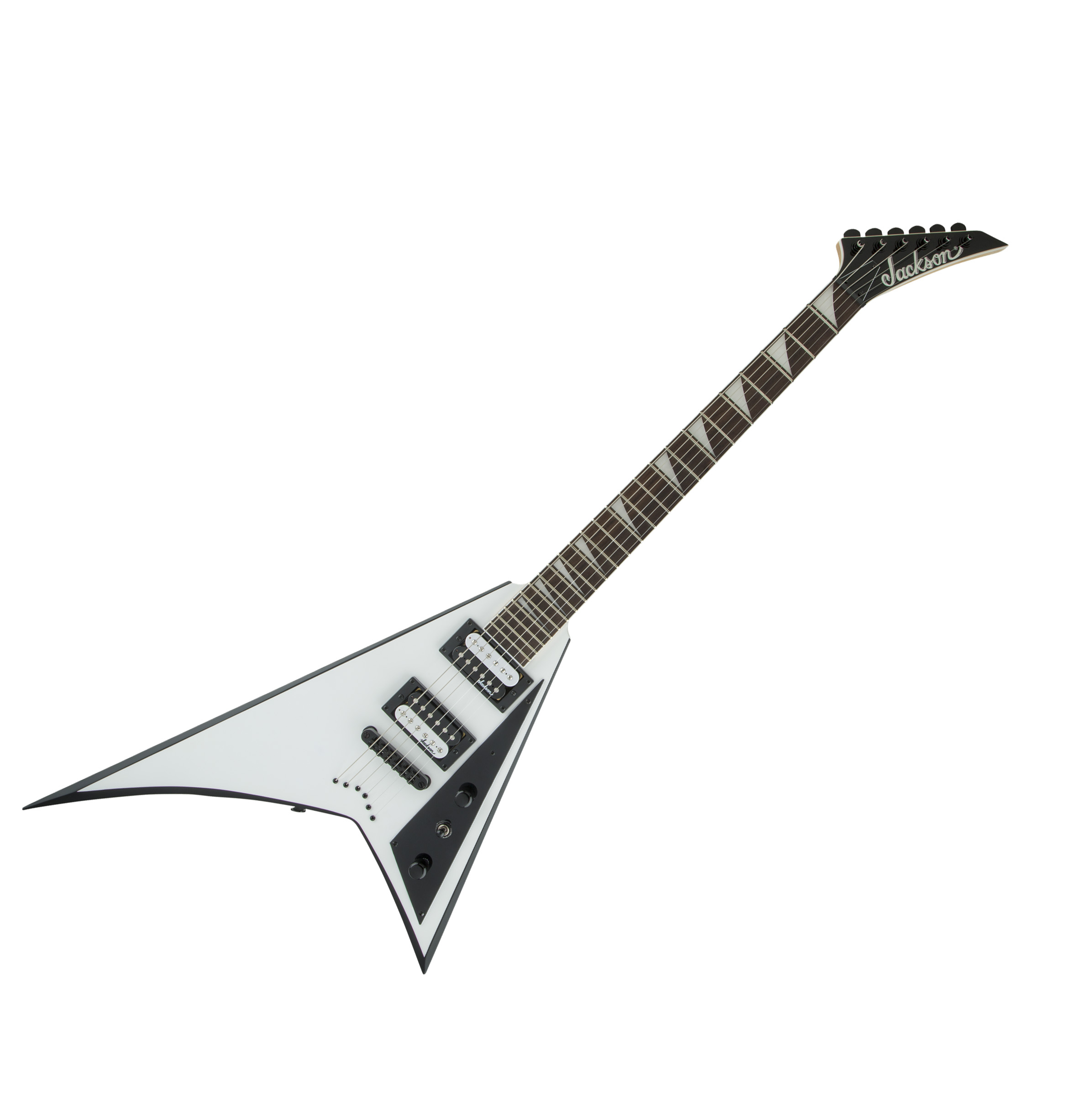 The JS Series Rhoads JS32T has a poplar body and a bolt-on maple speed neck with graphite reinforcement and scarf joint for rock-solid stability. Hosting 24 jumbo frets and pearloid sharkfin inlays, the 12”-16” compound radius fully bound amaranth fingerboard creates the ideal playing surface for fat riffs and easy chording near the black plastic nut while gradually flattening in the upper registers for lightning-quick solos and wide bends without fear of fretting out.