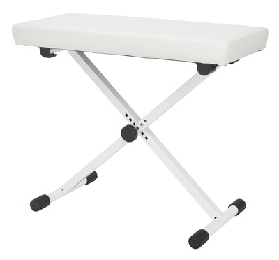Keyboard bench, size 650 x 300 mm, leather imitation covering, adjustable height 405 mm to 605 mm, recommended max. load 100 kg, padded seat, adjustable parquet feet, large seat, light and folds flat. Colour: white.