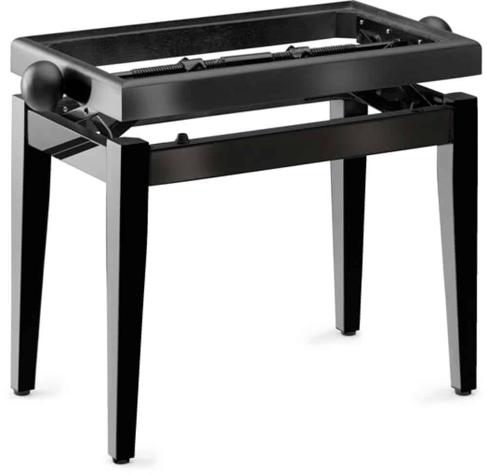 High gloss black piano bench without top. Material: Oak (structure). Feature: Dual cross precision lifting system. Adjustable height: 46 – 55 cm (18.1 – 21.7"). Top dimensions: 55 x 32 cm (21.6 x 12.6"). Weight: 7.5 kg (16.5 lb). To be assembled.