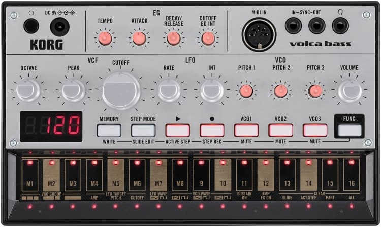 Analogue Bass Machine, Desktop Synthesizer / Analoge Groove-Box, three Oscillators, Analogfilter, one VCF, VCA, LFO and EG, Loop- and Step-Sequencer, Multitouch Trigger Pad / Step-Button, LED-Display, built-in Speaker, Power via 6x AA Battery. Optional power supply.