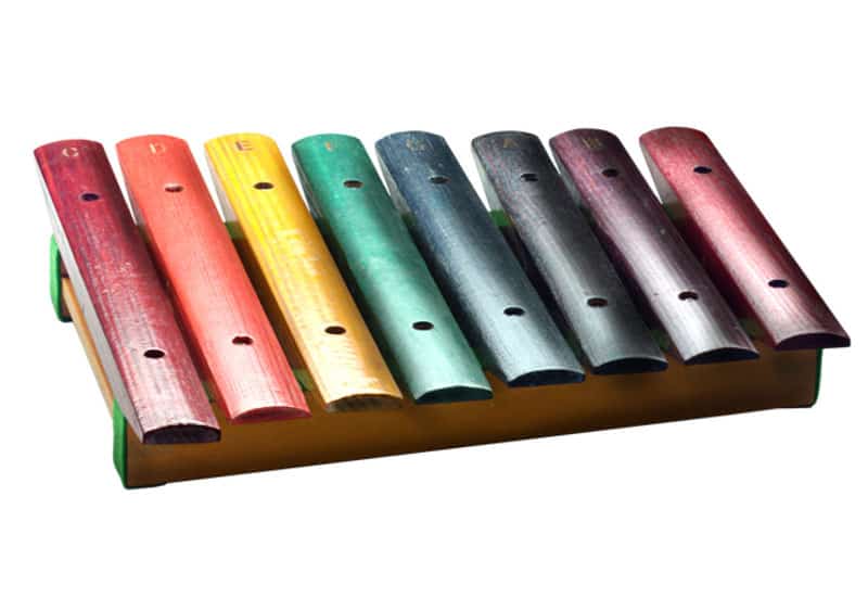 Xylophone with 8 colour-coded keys and two wooden mallets. Material: Pine (rack) and larch (keys). Notes: One octave (C to C). Dimensions: 23.3 x 24.3 cm (9.2 x 9.6"). Included: Two wooden mallets.