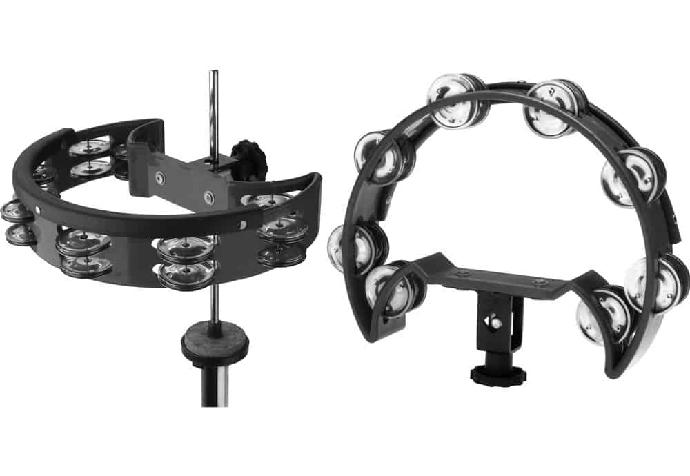 Half moon shaped plastic cutaway tambourine for Hi-hat stand – 16 jingles, black.