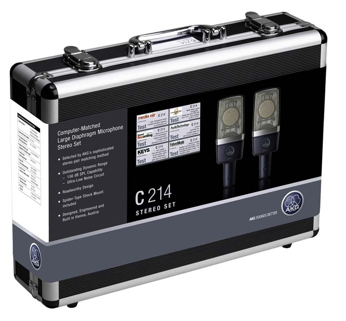 Computer-matched stereo pair based on C414 capsule, 2x large diaphragm microphones with cardioid polar patterns, 20Hz-20kHz, -20dB pad, requires phantom power. Includes clip, metal case and windshield
