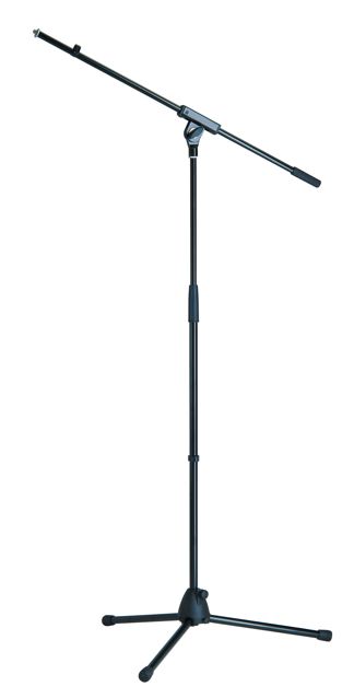 Inexpensive stand with professional features. Fiberglass-reinforced plastic base with foldable legs. Complete with boom arm.