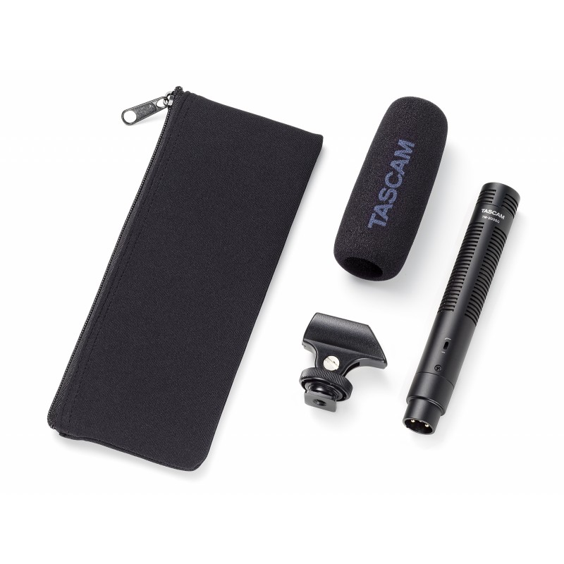 The TM-200SG is powered by phantom voltage. Shoe-mount clip, windscreen, and softcase are included as standard.