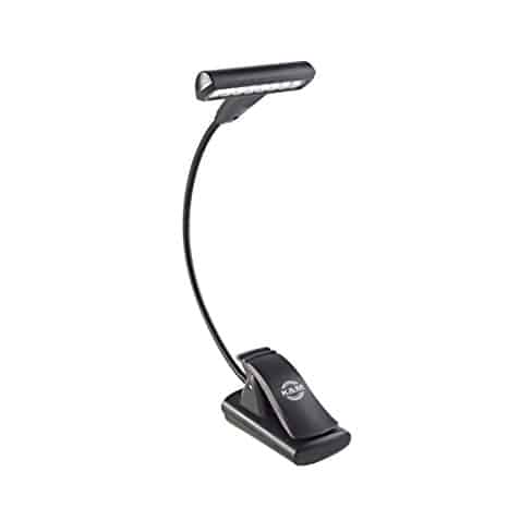 The powerful T-Model light provides very bright light through 8 powerful LEDs rated for 100,000 hours. With 2 brightness settings and the adjustable gooseneck the T-Model provides comfort and versatility to accommodate all sorts of lighting needs. The extra-wide clip (up to 25 mm) attaches to music desks, table tops etc. It can also be used as a standing light. The T-Model is powered by 3 (1.5 V AAA) batteries (included) with a typical battery life of 10 hours or an AC adapter (not included). The light comes with a durable carrying case as well.