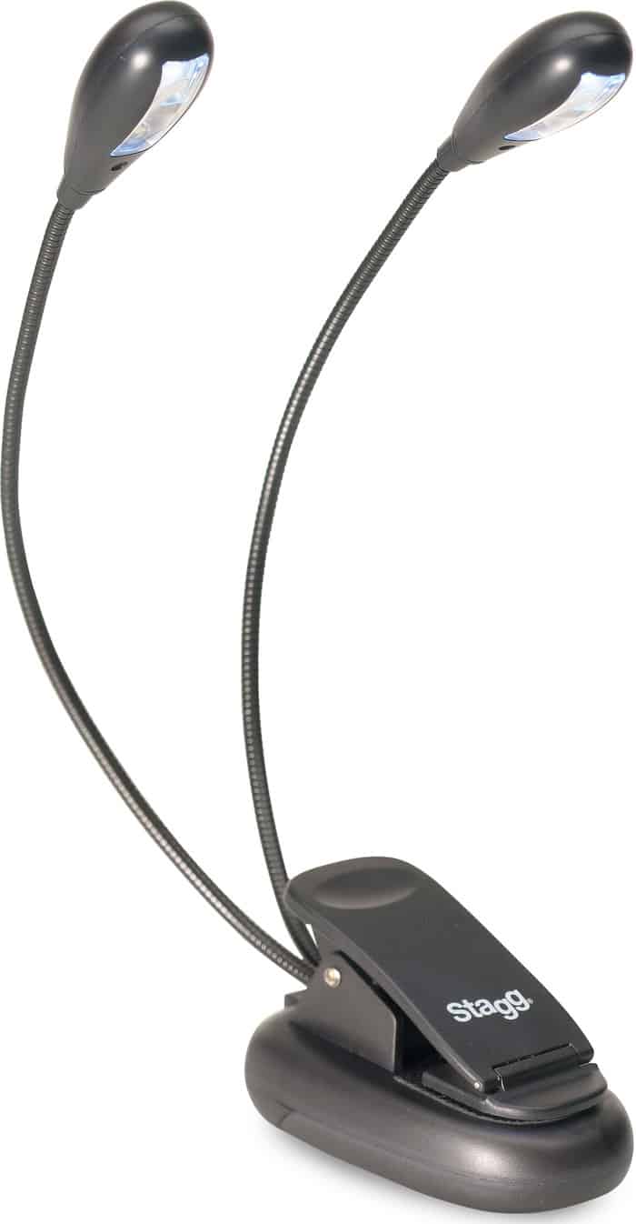 Clip-on and free-standing double LED lamp. Lighting: 2 x 2 LEDs. Brightness: 2 brightness levels selected with individual push switches. Neck: Two fully flexible goosenecks. Use: Free-standing or clip-on. Batteries: 3 x AAA (1.5 V) (included). Power cable: USB (included). Suitable for: Music stands, mixing desks, laptops, books.