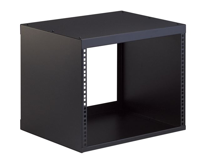 Sturdy steel 19″ rack with rack rails on the front and back side. 8 spaces. Appr. 430 mm deep.