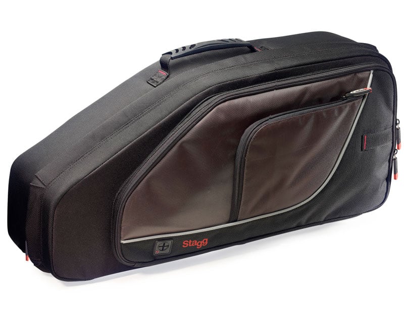 Lightweight, Deluxe wear-proof nylon soft case for alto saxophone. Features: outer compartment for small accessories. 2 ergonomic, slip-proof S-shaped transport straps with zippered cover for protection. Lush, padded interior. Stormflap to protect main zipper against rainfall. Easy-grip rubber zipper pullers. Injection-moulded easy-grip plastic handle.