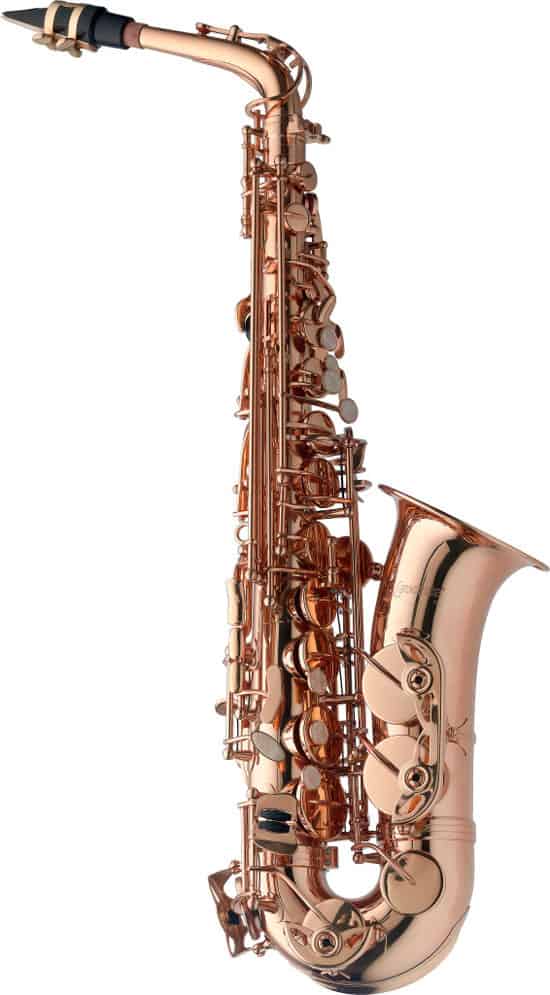 Eb alto saxophone, hand engraved, gold lacquered. Warm and brilliant sound. Adjustable thumb rest. High F# key. Incl. Soft case with backpack straps. Finish: Gold lacquered.