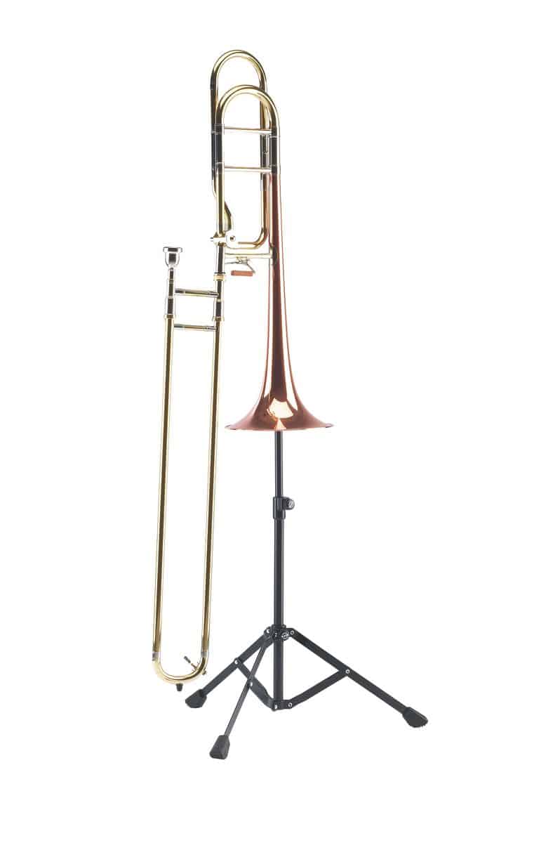 Trombone Stand, black, stable construction, sturdy two-section tubing, wide, flat tripod base, adjustable plastic peg, easy height-adjustment with smooth clamp assembly, compact, easy to fold. Height: 555/865mm.