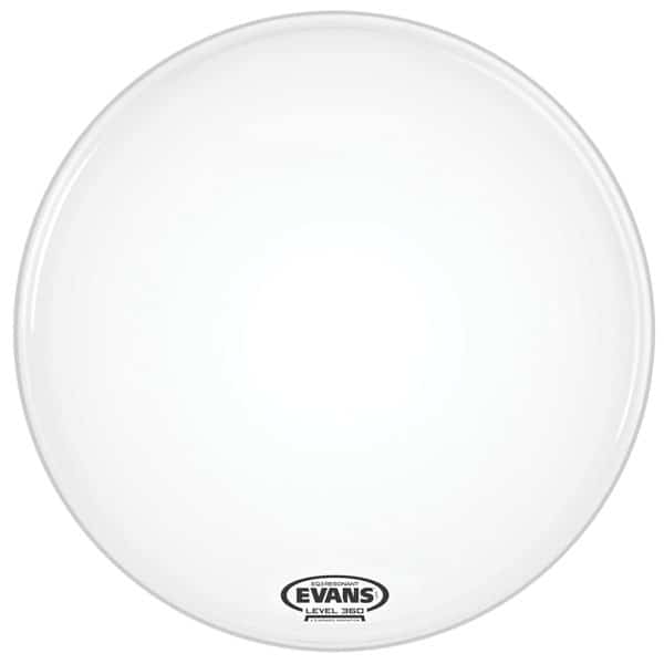 22" EQ3 coated white bass drum head, no port. Evans™ EQ3™ resonant no-port series features a single ply of 6.5mil film with a 10mil internal overtone control ring.