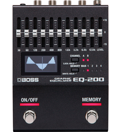 Boss EQ-200 Graphic Eq, studio-level stereo sound with 32-bit/96 kHz processing, 4 memory places, LED display, MIDI, USB, controls: 10 slide controls from 30Hz to 12,8kHz, Level, Channel, Memory, 2 footswitches, 2x 1/4 Input (A/Mono, B), 2x 1/4 Output (A/MOno,B) 1x 1/4 jack for external switches or expression pedal, power supply by 3x AA-size batteries or AC adapter (not included), current draw: 170 mA, Dimensions: (W) 4″ x (D) 5,4″ x (H ) 2,5″, weight: 1,7 lbs