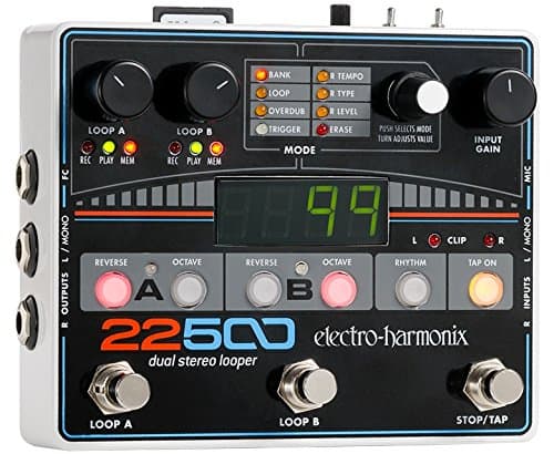 – Dual stereo loops with independent or locked loop lengths- Sequential looping mode enables verse/chorus switching- Parallel looping mode allows simultaneous playback of two loops- 16 built-in drum loops- Selectable microphone input with phantom power- Reverse and Octave functions- Undo-Redo your last overdub or recording- Quantize or non-quantize (free running) modes- USB port enables backup/restore to PC or Mac- Programmable third footswitch for Stop or Tap Tempo- Optional external Loop Up/Down Foot Controller- EHX 9.6VDC-500mA power supply included- Current Draw: 235mA @ 9VDC- Dimensions in inches: 4.75(w) x 5.75(l) x 2.5(h)- Dimensions in mm: 121(w) x 146(l) x 64(h)
