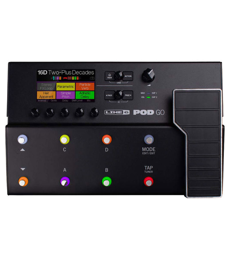 Line6 Pod GO; Multi Effects Pedal for Electric Guitar; over 300 effects and models from Helix, M-Series and Legacy products, up to 6 simultaneous amp, cab, and effects models including a looper and a speaker cabinet simulation (Third-Party IR loading), Onboard expression pedal, Compact, ultra-portable, lightweight design, Free POD Go Edit app; Controls: Interbal, Cents, Delay, Shiftlevel, Mix, Menu, Save, Volume; LED: 8x Footswitches Effect; Display: 4,3″ Color LCD; Footswitches: Up, Down, A, B, C, D, Mode, Tap/Tuner; Connections: Guitar In (1/4″ Jack), EXP 2/Footswitch (1/4″ Stereo Jack), Send & Return (2x 1/4″ Jack), Main Out Left & Right (1/4″ Jack), Amp Out (1/4″ Jack), Phones (1/4″ Jack), USB Type-B; Power Supply connector: Barrel Connector 5.5 x 2.1 mm, center negative; Current Draw: 2500 mA; powered by a 9 V DC Power Supply (included); no Battery operation